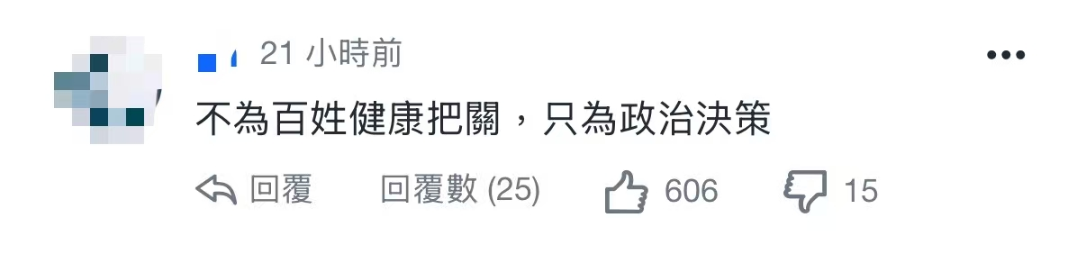 此舉迅速引發(fā)島內質(zhì)疑,網(wǎng)友對民進(jìn)黨當局這一做法罵聲一片。有人批評說(shuō),臺當局此舉“不為百姓健康把關(guān),只為政治決策”“政治作秀,犧牲人民健康”。↓